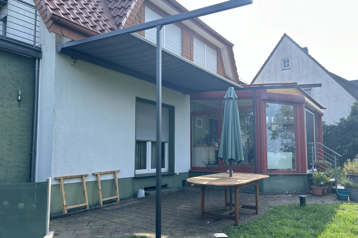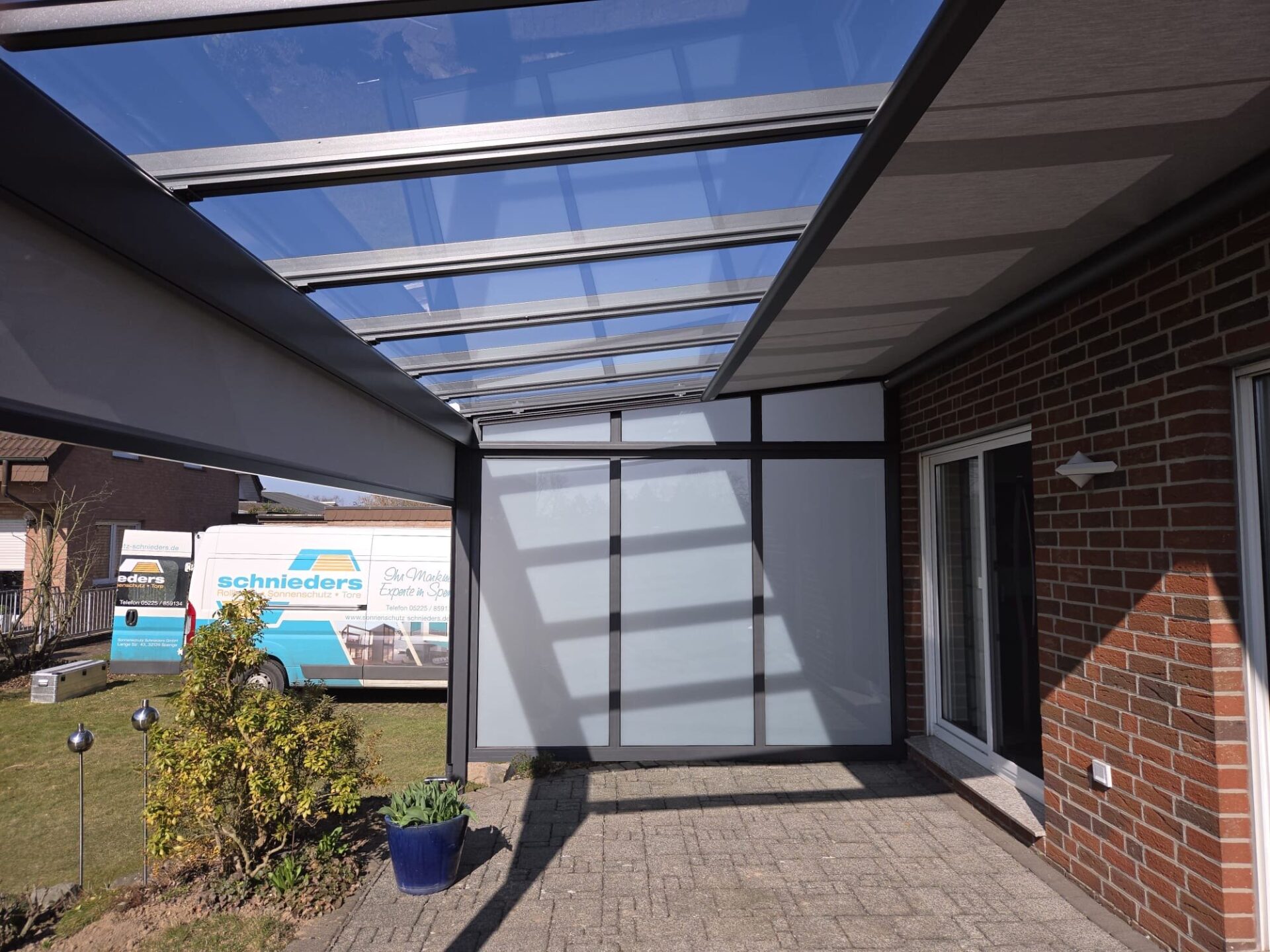 Terrassendach Q100 von Erhardt in Melle – kombiniert mit zwei markilux 779 Unterglasmarkisen mit tracfix-System.